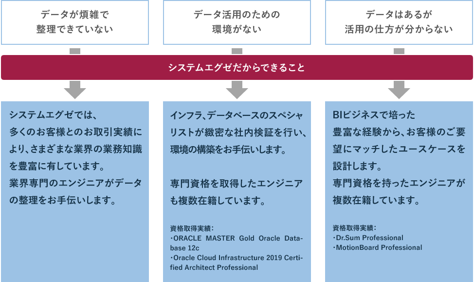 システムエグゼが得意とするデータベース技術を活かし、データ管理の見直しからデータ活用までワンストップでのサポートが可能です。 確かな技術に基づいた、経営判断や新規ビジネスに生かせるデータ分析・活用サービスをご提供します。