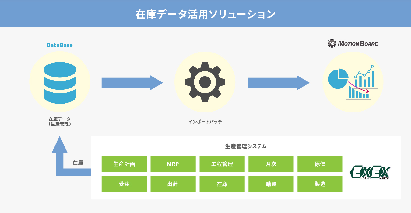 在庫データ活用ソリューションは、BIツール「MotionBoard」を活用したソリューションです。