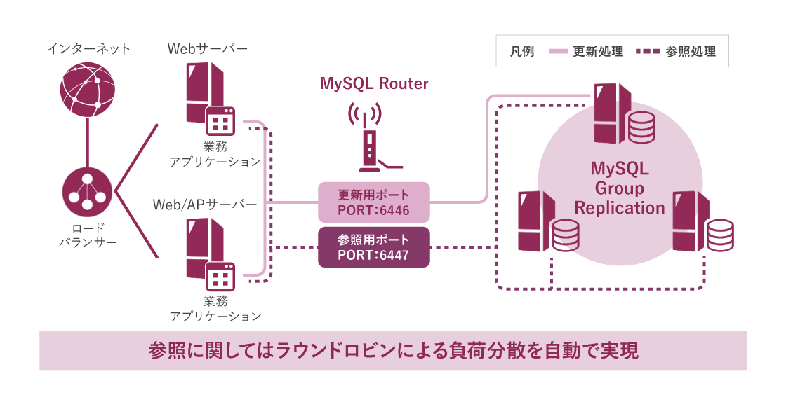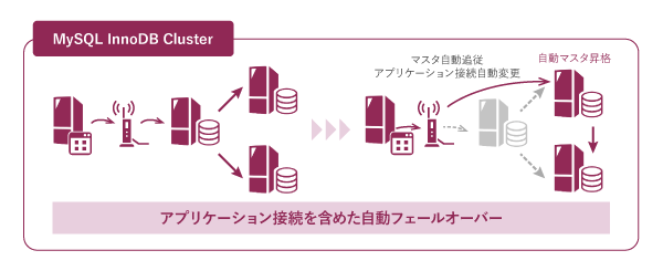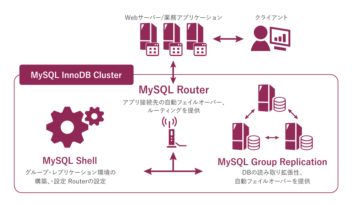 「MySQL Group Replication」によりフェイルオーバーを手動、または複雑なスクリプトで処理する必要がなく、「MySQLRouter」によりアプリケーション側はMySQLの状態を意識することなく利用することができます。