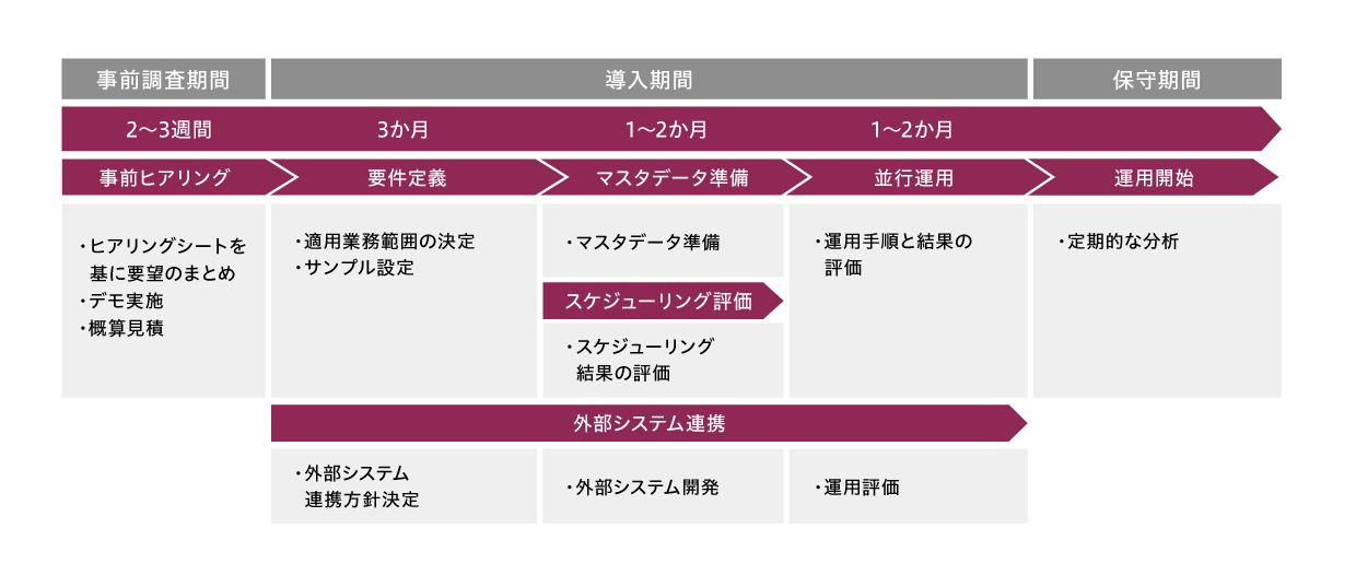 スケジューラの導入は無償でのご提案から始まり、製品導入やシステム稼働後の分析を含めて複数のSTEPに分割して進めることを基本としています。